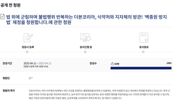 매체에 따르면 21일 국회 전자청원에는 ‘법 위에 군림하며 불법행위 반복하는 더콘코리아, 식약처와 지자체의 방관, 백종원 방지법 제정을 청원한다’는 제목의 청원글이 제기됐다.